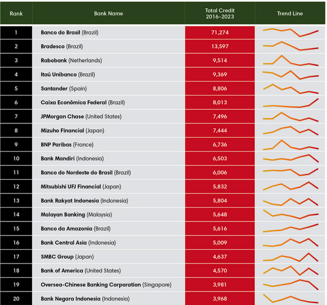 本報告書「生物多様性崩壊をもたらす金融業務:熱帯林破壊を助長する銀行と投資家の追跡」は、世界の熱帯林破壊の大部分を引き起こしている「森林リスク産品」セクターの6品目(牛肉、パーム油、紙パルプ、ゴム、大豆、木材)に携わる約300社の森林部門事業に対する商業資金の流れを概説・分析しています。報告書では、森林リスク産品セクターへの融資・引受と債券・株式保有において、どの銀行と投資家が最も大きな役割を果たしているかを明らかにしています。森林破壊を引き起こすリスクの高い銀行、つまり資金提供額上位30行のなかには、ブラジルやインドネシアなどの熱帯林諸国の大手銀行や、米国、欧州連合(EU)、日本、中国といった輸入および財政的に重要な管轄区域の大手銀行が含まれます。