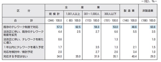 3歳未満の子を養育する従業員については、「既存のテレワーク制度で対応」が57.3%で半数以を超える一方で、「対応する予定はない」と回答した企業は34.0%であった[図表1]。