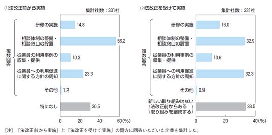 法改正前から実施していた取り組みでは、「相談体制の整備・相談窓口の設置」が56.2%で最も高い。法改正後に新しく実施した取り組みも、「相談体制の整備・相談窓口の設置」が最多の32.9%だが、「従業員への利用促進に関する方針の周知」(32.3%)と拮抗する[図表2]。