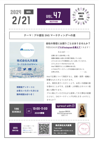 弊社がSNSコンサルティングをさせていただいている丸天産業様のSNSの歴史が丸わかり!講師役として、弊社SNS担当の岩田が登壇し、企業ならではの悩みに寄り添い、Instagramの運用ポイントをお教えします。「企業に合う人材が欲しい方」、「実際の業務とは別に片手間で発信している方」、「Webで発信することに興味がある方」などに必見の内容となっております。