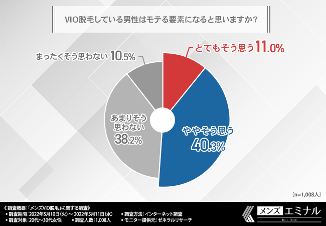 そこで、「VIO脱毛している男性はモテる要素になると思いますか?」と質問したところ、半数以上の方が『とてもそう思う(11.0%)』『ややそう思う(40.3%)』と回答しました。