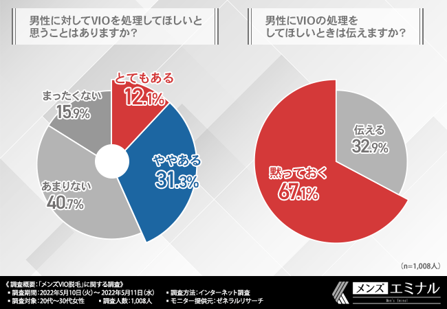 そこで、「男性に対してVIOを処理してほしいと思うことはありますか?」と質問したところ、4割以上の方が『とてもある(12.1%)』『ややある(31.3%)』と回答しました。