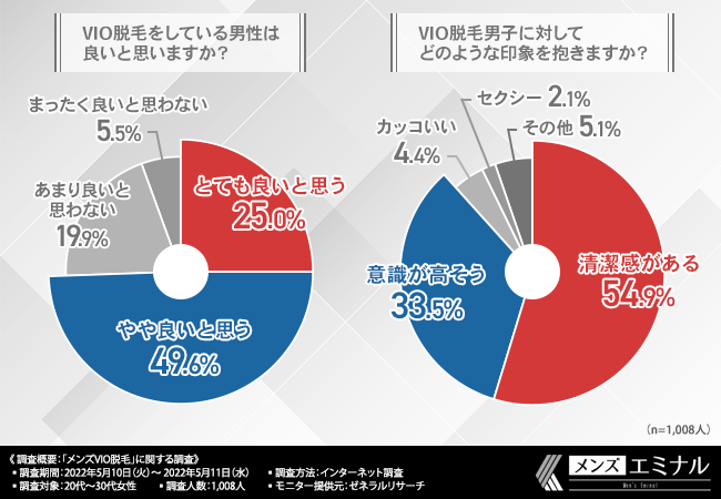 近年は男性の脱毛も広く普及している中、多くの女性は男性の脱毛に肯定的で、特に清潔感があると高く評価してくれている調査結果となり、さらにVIOの処理についても肯定的な女性が多く、モテ要素の一つにもなりつつあるようです。