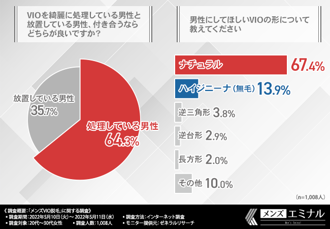 「VIOを綺麗に処理している男性と放置している男性、付き合うならどちらが良いですか?」と質問したところ、7割近くの方が『処理している男性(64.3%)』と回答しました。