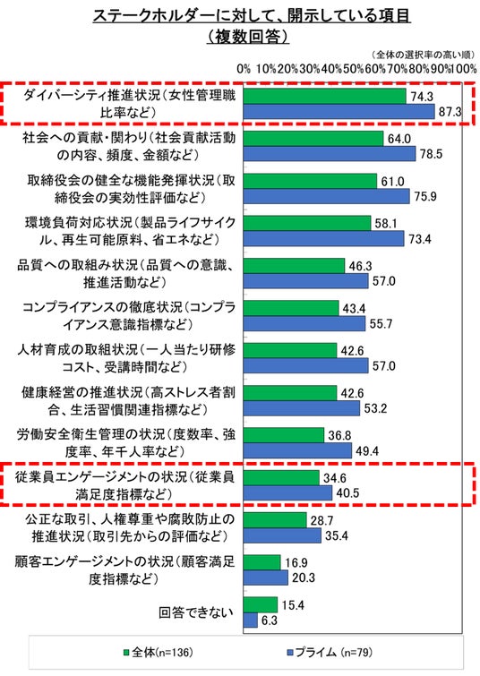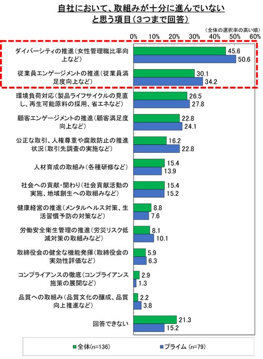 5.ダイバーシティ推進状況の情報開示は東証プライム企業で9割近く、一方、従業員エンゲージメントは約4割に留まる。(図6)また、ダイバーシティ推進や従業員エンゲージメントの推進は取組みが十分でないと認識されている項目の上位。(図7)