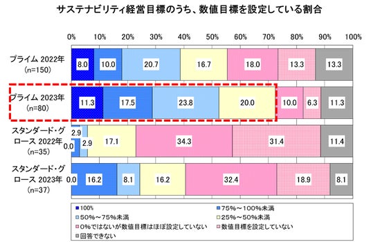 1.サステナビリティ経営目標のうち数値目標を設定している割合が50%~100%の企業が前回より約1割増える。(図1)東証プライム企業では、7割以上が25%以上の数値目標を設定。(図2)