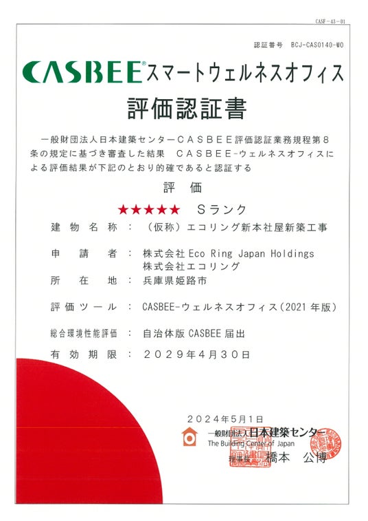 リユースサービス事業を日本やアジアで展開する株式会社エコリング(本社所在地:兵庫県姫路市、代表取締役:桑田一成、以下、「エコリング」)は、サステナブルな新本社の建設に取り組んでおり、2025年2月より稼働予定です。この建物は、環境配慮型の設計に加え、社員のウェルビーイングに配慮し、心身ともに充実した職場環境が備わっています。これらの取り組みが評価され、第三者認証機関において「CASBEE‐スマートウェルネスオフィス評価認証」において最高位となる「Sランク評価」を取得いたしました。