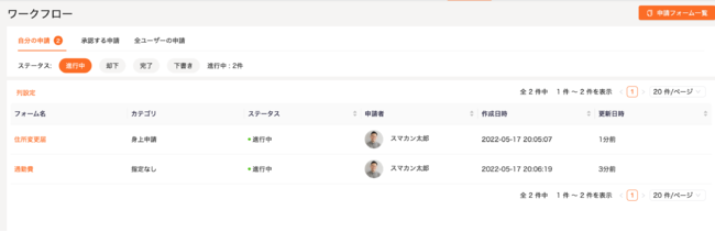 「ワークフロー」機能とは、社内申請における社員の各種申請をクラウドシステム上で行う機能です。本機能で申請されたデータは『スマカン』の人材データベースに自動反映が可能となり、メールの確認漏れや各種申請用紙の紛失といった人為的なミスの削減に加え、これまで管理者や人事担当者が抱えてきた業務の大幅な効率化をサポートします。