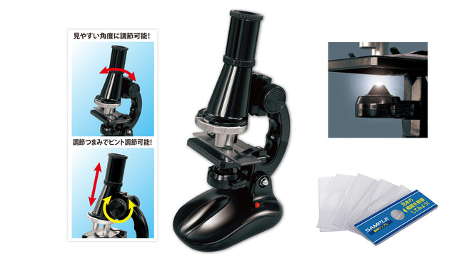 特徴:拡大倍率が450倍・200倍・100倍で繊維や結晶などを観察することができます。またスライドガラスと、観察サンプル、観察物を収集できるコレクション用ボトルが付属。自由研究や学習をもっと楽しめる顕微鏡セットで、ミクロの世界を観察してみよう!