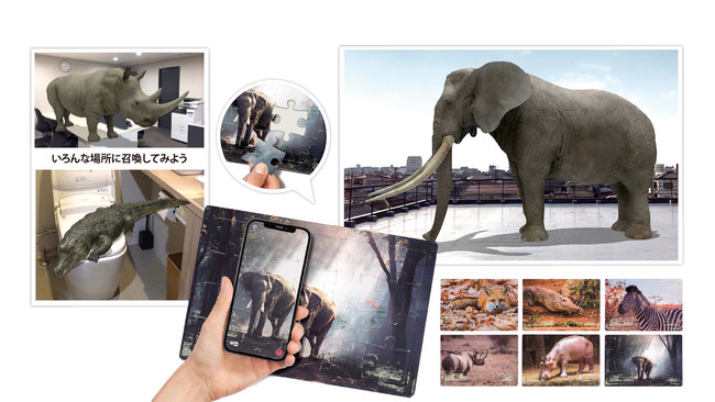 特徴:パズルを組み立てて、スマホで動物を召喚!? ゾウやワニ、カバ、サイなどリアルな動物全6種類を360°好きな視点で楽しめる! お気に入りの場所で撮影してみよう。