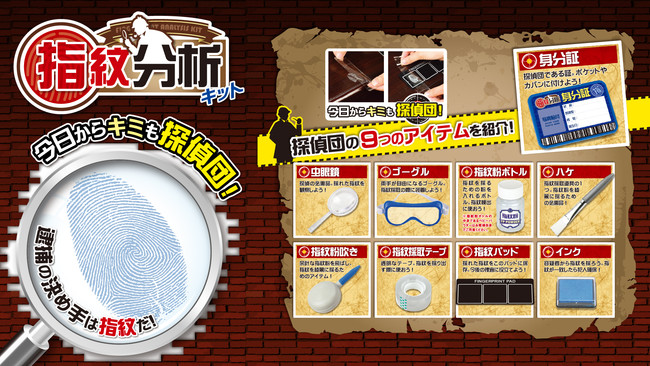 特徴:探偵団になりきれるアイテム9種類がセットになって登場。指紋を調査して犯人をみつけよう。身分証をポケットやカバンにつけて、今日から君も探偵団!