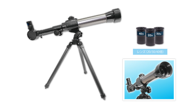 特徴:手軽に天体を観察できる天体望遠鏡セット。接眼レンズの交換やピント調節も可能で、月や星を観察することができます。20倍・30倍・40倍の3種類のレンズと三脚台を付属。課題研究や学習にぴったり、天体観測で無限に広がる宇宙を観察してみよう!!