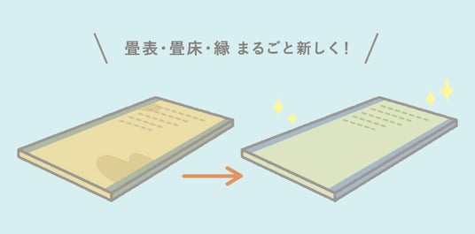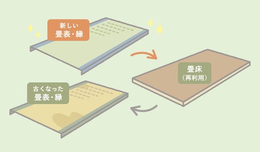 表替え(張替え)畳床(畳の中材)はそのまま、畳表(ござ)と縁を新しいものに取り替えます。