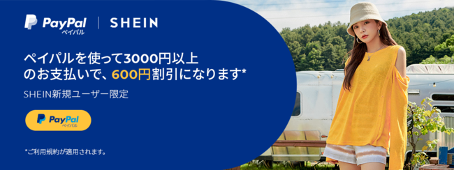 内容: 「SHEIN」新規ユーザー限定で、PayPalを使用し、3,000 円以上のお支払いで、600円割引となります。