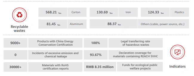 電子廃棄物を最小限に抑えるために、同社は品質問題と製品の有効期限によって発生する電子廃棄物と電気製品のリサイクル計画を策定しました。このスキームには、マテリアルリターン、マテリアル受け入れ、廃棄評価、廃棄プロセス、およびスクラップ管理が含まれます。これらはすべて、リサイクルプロセス全体の完全な制御を実現するために標準化されています。