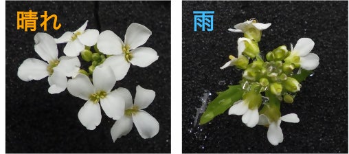 研究で用いた植物、アブラナ科のハクサンハタザオは福井県にも自生し、白い小さな花をたくさん咲かせます。晴れた日には花が一斉に太陽の方向を向く一方で、雨の日には花が下を向きます。晴天時に花が上を向くのは、花柄(花の下の茎)が青色光の方向に伸びるためであり、上を向くことで昆虫による花粉の持ち出しが促進され結実も良くなりました。一方で雨天時に下を向くのは、低温や青色光が弱い条件で花柄が重力の方向に伸びるためであり、下を向くことで雨粒による花粉へのダメージを軽減していました。これらのことから、花の向きを天候に応じて変えることは植物の積極的な応答であり、植物が子孫を残す上で有利な特性であるといえます。