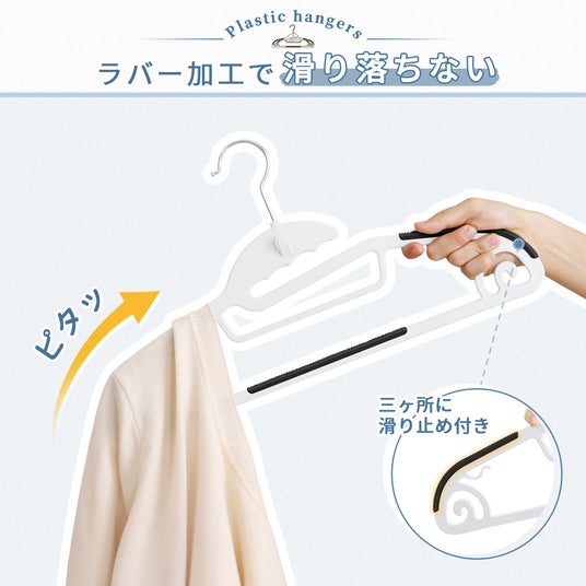 ラバー加工でどんな衣類もしっかりキャッチ。