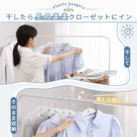 洗濯用としても使用でき、乾いたらそのままクローゼットへ。たたむ手間が省けるので取り込む手間も省けます。