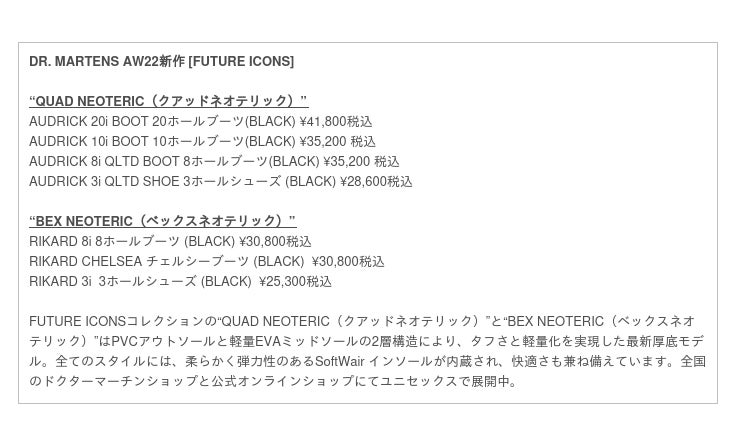 コレクションのメインシルエットである“QUAD NEOTERIC(クアッドネオテリック)”シリーズと“BEX NEOTERIC(ベックスネオテリック)”シリーズは、スタイリッシュなデザインと軽量で快適な履き心地を実現すると同時にドクターマーチンらしい反逆精神をモダンなシルエットで表現しています。
