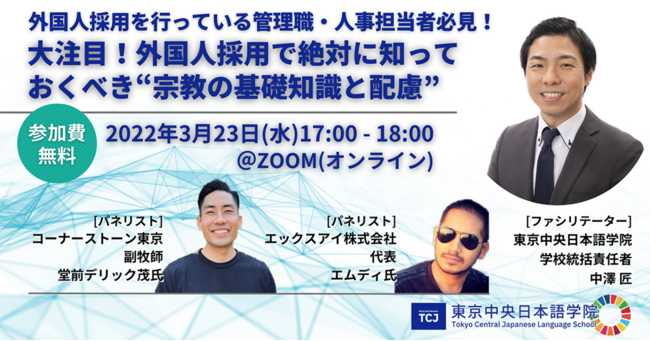 外国人社員の定着、活躍推進に取り組む法人や各種団体に対し、日本語学習のサポートや職場の受け入れ体制づくりをアドバイスする東京中央日本語学院(本校舎:東京都新宿区。以下TCJ)は2022年3月23日(水)、外国人社員の管理者や採用担当者が知っておくべき宗教の基礎知識をテーマにオンラインセミナーを開催します。