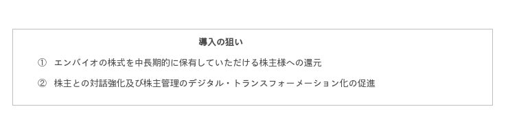 エンバイオは、より多くの株主様に中長期的に当社株式を保有いただくための、さまざまな議論を進めてまいりました。その中で、ポイントを活用した4,000種類以上の中からの商品交換ならびに、共通株主優待コインへの変換などのシステムを活用でき、かつ株主管理のDX化推進にも取り組める、株式優待制度「エンバイオ・ホールディングス・プレミアム優待倶楽部」を導入いたします。