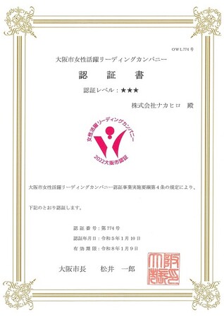 ニッケグループの株式会社ナカヒロ(大阪市中央区、以下ナカヒロ)は、2023年1月10日付で「大阪市女性活躍リーディングカンパニー」の三つ星・イクメン推進企業として認証されました。