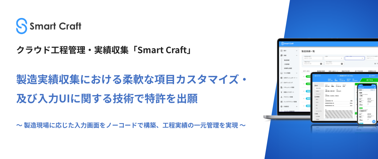 株式会社Smart Craft(本社:東京都渋谷区、代表取締役:浮部史也、以下「当社」)は、製造実績収集において工程ごとに柔軟な項目設定が可能となる入力UI設計技術(以下「本技術」)について、特許を出願したことをお知らせいたします。本技術は、これまでシステム化が困難とされていた多様な製造現場の工程管理に対応し、各工程に最適な入力項目を容易に設定・管理できる仕組みを提供するものです。