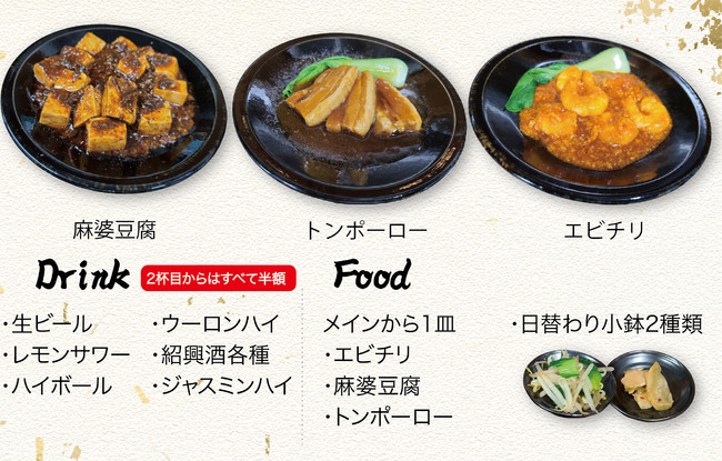 ドリンク:生ビール、レモンサワー、ハイボール、ウーロンハイ、紹興酒各種、ジャスミンハイから1杯