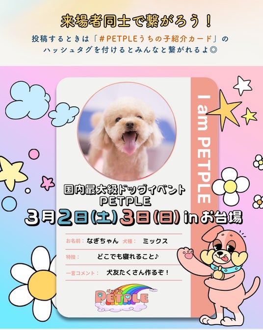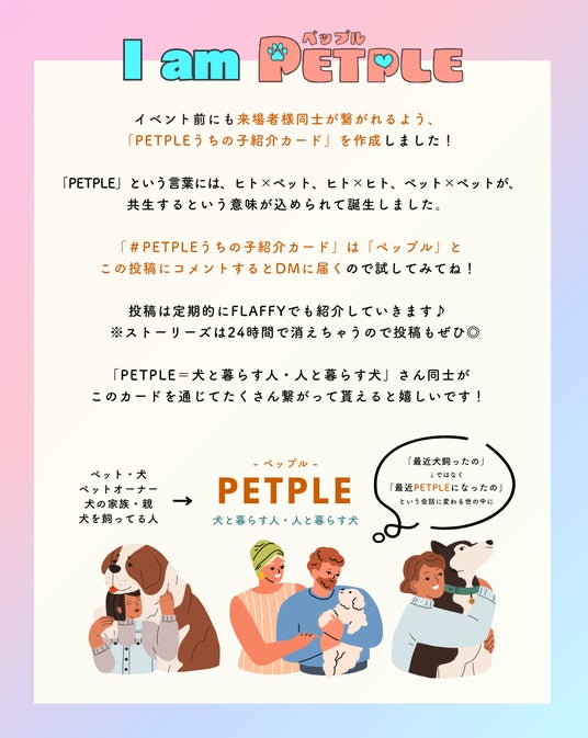 当イベント開催にあたり、イベント前にも来場者様同士が繋がれるよう、 「 #PETPLEうちの子紹介カード 」を作成しました。FALFFY.me( https://www.instagram.com/p/C2pE5mlPbpe/?img_index=1 )の投稿にコメントするだけでテンプレートがゲットできるので、イベント参加のPETPLEは、ぜひ書いてみてください。