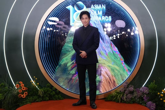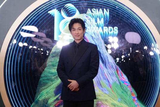 俳優のディーン・フジオカは、ミッドナイトブルーのピークドラペル・イブニングジャケットに、ブラックのイブニングトラウザーズを合わせ、コットンのイブニングシャツ、シルクアクセサリー、パテントシューズを着用しました。