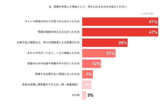 禁煙失敗においては「ストレス解消の代わりが見つからなかった(47%)」「喫煙の衝動を抑えられなかった(47%)」が主な理由に。ストレス管理が禁煙の成否に大きな影響を与えることがわかります。