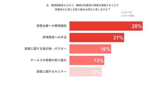 喫煙経験者が効果的だと感じる取り組みは「禁煙治療への治療補助(28%)」「非喫煙者への手当(21%)」と、企業の取り組み内容と差が出る結果に
