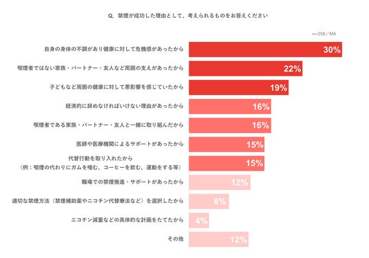 ・禁煙成功の理由は「健康への危機感(30%)」と「周囲のサポート(22%)」