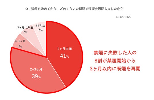禁煙に失敗した122名に、禁煙開始後から喫煙再開までの期間を聞いたところ、8割が禁煙開始から3ヶ月以内に喫煙を再開していたことがわかりました。禁煙においては、始めの3ヶ月目までが極めて重要であることが示されています。