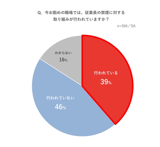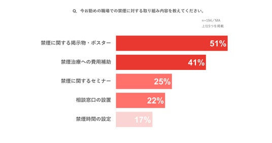 「職場で禁煙の取り組みが行われている」と回答したのは約4割。取り組み内容は「禁煙移管する掲示物・ポスター(51%)」「禁煙治療への治療補助(41%)」