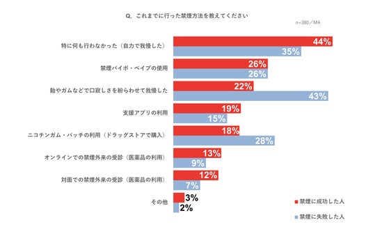 禁煙に失敗した人では、「飴やガムなどで口寂しさを紛らわせて我慢した(43%)」がトップとなっており、次いで35%が「特に何も行わなかった(自力で我慢した)」と回答しています。禁煙の成否を問わず、自力で我慢するほか、「禁煙パイポ・ベイプ」や「飴やガム」など口寂しさを満たすことで禁煙に取り組んでいる人が多いようです。