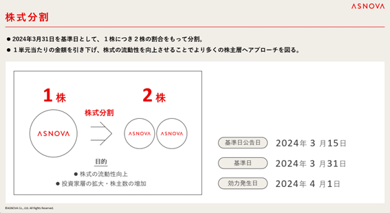 当社株式は2024年3月31日を基準日(基準日公告日:2024年3月15日(金)、効力発生日:2024年4月1日(月))とし、1:2の割合で株式を分割いたします。