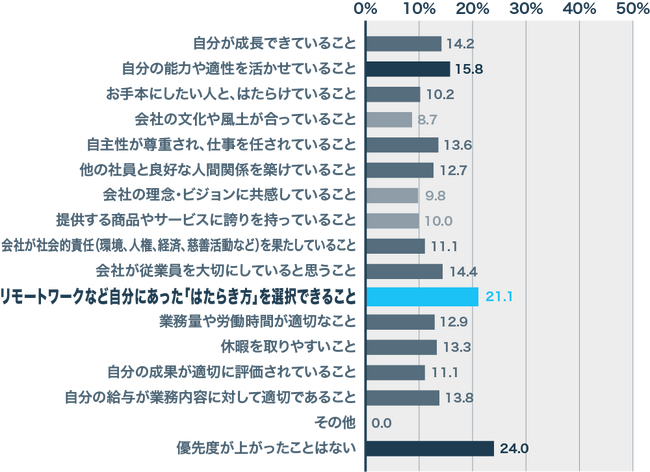 コロナ禍以降「はたらきがい」が多様化していると思う人は 81.1%という結果に。コロナ禍以前「はたらきがい」を感じる上で大切だと思っていたことは「自分の能力や適性を活かせていること(26.9%)」「自分の給与が業務内容に対して適切であること(26.4%)」ほか、「自分の成果が適切に反映されていること(24.7%)」「自分が成長できていること(24.2%)」など評価・成果主義志向が目立ちます。コロナ禍以降「はたらきがい」を感じる上で優先度があがったことでは「リモートワークなど自分にあった「はたらき方」を選択できること(21.1%)」が 1 番多い結果となりました。コロナ禍を経て「はたらきがい」は評価・成果主義志向に加え、ライフスタイル調和の傾向も見られるようになり、より多様化が進んでいると伺えます。
