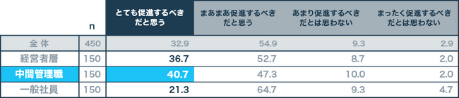 経営者層が「とても重要だ」と思っていることも一般社員にとっては重要でない可能性も伺え、社員ごとのニーズをしっかりと把握することが大切だと考えられます。