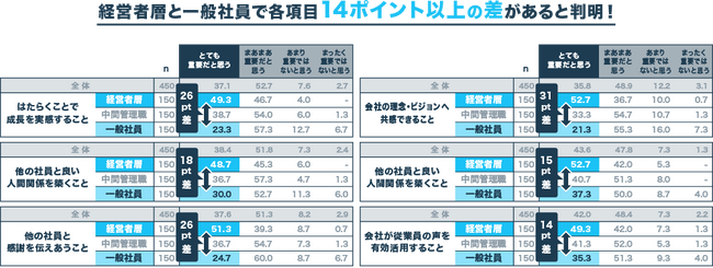 ●組織にとって重要だと思うこと、経営者層と一般社員で各項目 14 ポイント以上の大きな差があると判明!