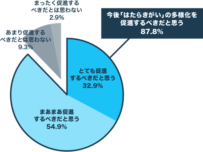 今後「はたらきがい」の多様化を促進するべきだと回答した人は約 9 割(87.8%)。その理由として「一人ひとりがはたらきやすくなると思うから(54.4%)」「様々な人に、はたらく機会が与えられると思うから(51.1%)」「意欲化・効率化につながると思うから(46.8%)」が続く結果となりました。理由からも一人ひとりにあわせたはたらき方の重要性が高まっていると考えられます。
