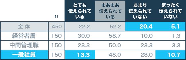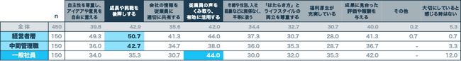 また、企業がはたらく人を大切にしていると感じるときで一番多かった回答は経営者層(50.7%)と中間管理職(42.7%)が「成長や挑戦を後押しする」に対し、一般社員(44.0%)は「従業員の声をくみ取り、有効に活用する」でした。一般社員にとって、意見を吸い上げ改善・活用していくことが重要という傾向が伺えます。