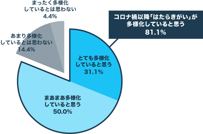 本調査では、コロナ禍以降「はたらきがいが多様化している」と回答した人は 81.1%と判明。約 9 割が、今後「はたらきがい」の多様化を促進するべきとも回答しています。「はたらきがい」は人それぞれでコロナ禍を経てライフスタイル調和の傾向もみられるようになり、多くの人が多様化を実感していると考えられ、はたらく人一人ひとりの声に耳を傾ける必要性がわかります。