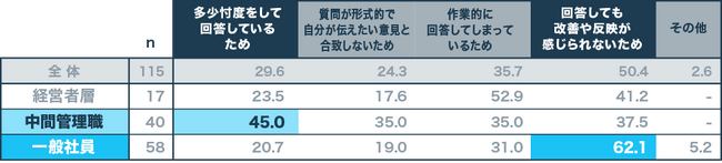 ●4 人に 1 人がサーベイで自分の意見を伝えられておらず、特に一般社員はその傾向が高いと判明