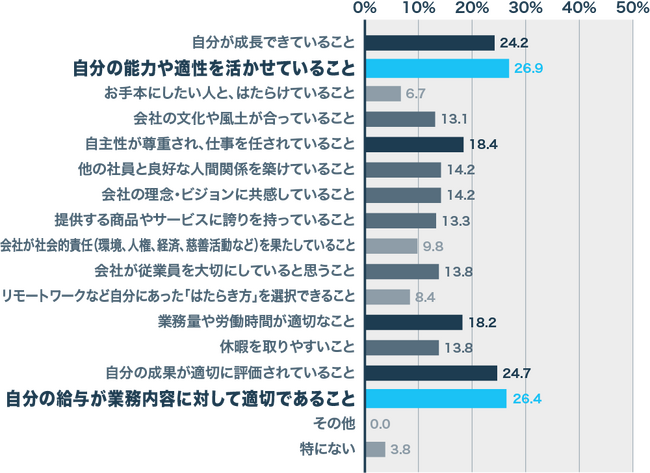 7 割以上が今の仕事に「はたらきがい」を感じており、その理由として「自分の能力や適性を活かせているから(39.4%)」などがあがっています。一方、4 人に 1 人(25.5%)が「はたらきがい」を感じていないと回答しており、その理由として「自分の成果が適切に評価されていると思わないから(34.8%)」「自分の給与が業務内容に対して適切だと思わないから(32.2%)」「会社が従業員を大切にしていると思わないから(27.8%)」と続きました。多くの人が「はたらきがい」を感じている中で、自身の評価についてと会社の姿勢への声もあがりました。