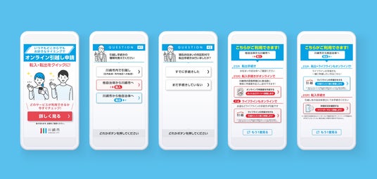 - 最適な手続きサービスへのスムーズな誘導診断結果に基づき、川崎市の「ネットdeスマート」や国の「マイナポータル」、民間の「引越れんらく帳(ライフライン手続)」など、その人に最適な手続きサービスの起動画面や案内ページへ動画から直接誘導します。 これにより、利用者の迷いを解消し、適切な行動を促します。
