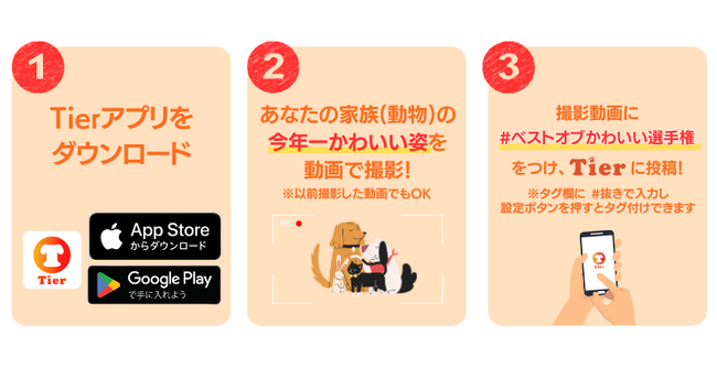 #ベストオブかわいい選手権 のハッシュタグをつけた、あなたのご家族(動物)の今年1番かわいい動画をTierアプリ内に投稿していただき、優秀賞に選ばれた動画を、2024年2月1日(木)~2024年2月29日(木)までの1ヶ月間、日本最大級の縦型ビジョン 渋谷愛ビジョンにて放映させていただきます。