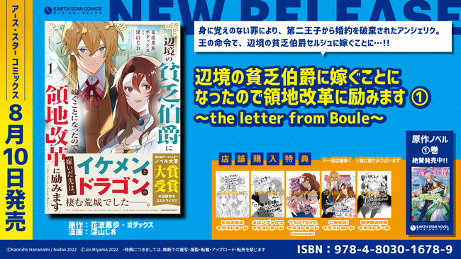 アース・スタールナより刊行している人気ノベル作品が原作で、現在コミック アース・スターで連載中の人気作品『辺境の貧乏伯爵に嫁ぐことになったので領地改革に励みます ~the letter from Boule~』コミックス第1巻を8月10日(水)に発売いたします。