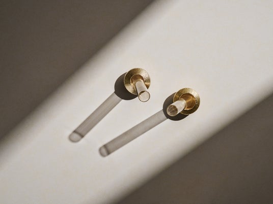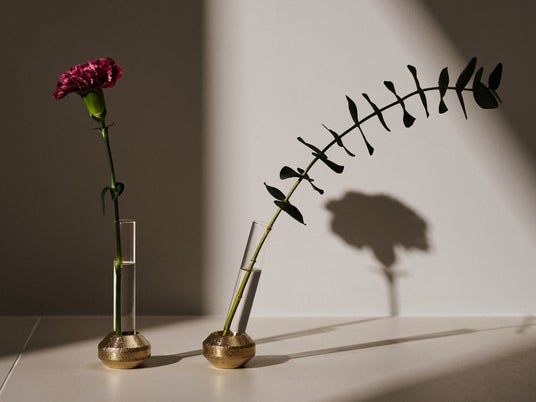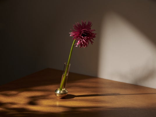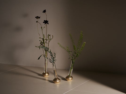 a/sym(アシム)は、真鍮製の台座とガラス管を組み合わせた小ぶりな花瓶です。ガラス管を垂直に立てればシンメトリーな佇まいに、台座にそっと持たせかけることでアシンメトリーな表情へと変化します。置き方ひとつで異なる印象を生み、さまざまなアレンジをお楽しみいただけます。