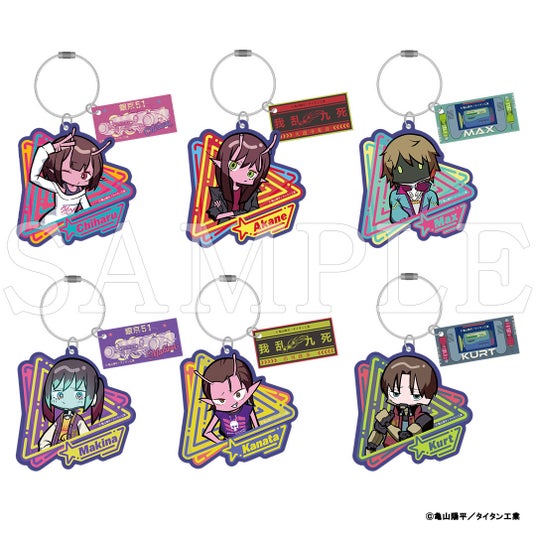 キャラクターの描き起こしイラストと、個性的なデザインパーツがセットになったアクリルキーホルダー。カバンや小物につけてお楽しみください。